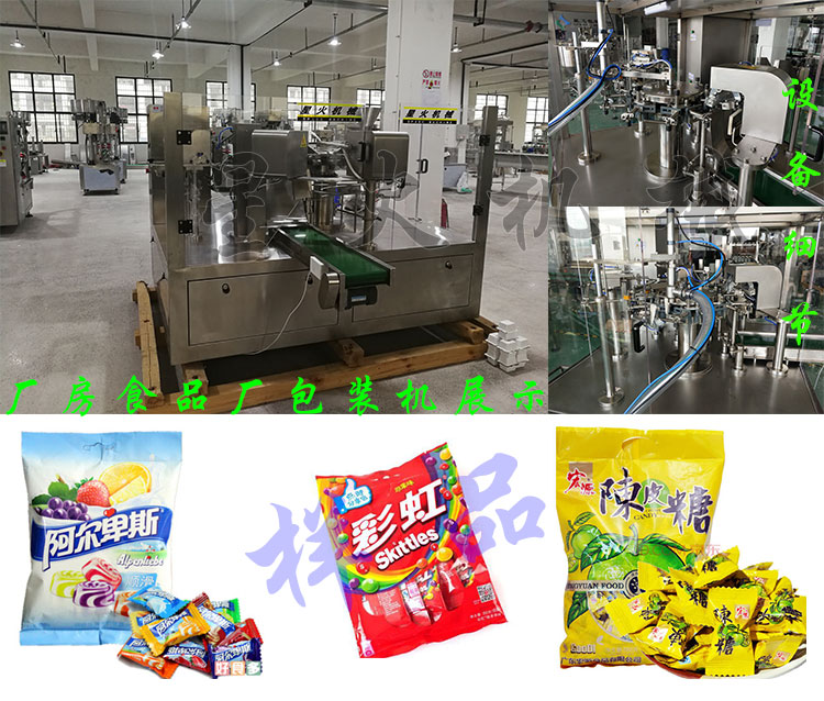 星火厂房食品厂包装机、糖果包装机细节及全自动糖果包装机包装样品展示