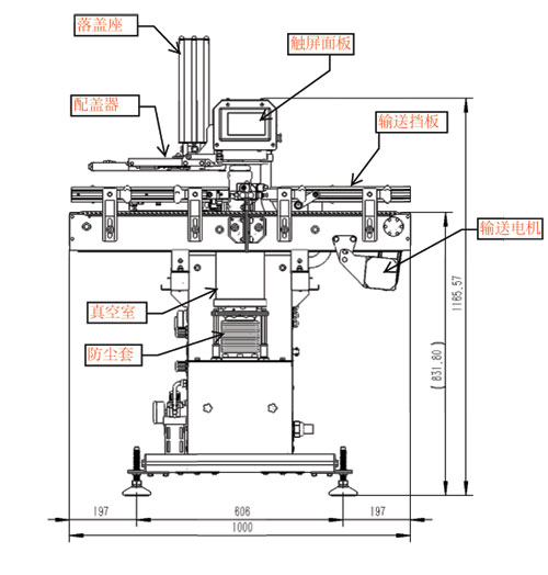 完成灌装工序没有加盖子的瓶子从机器的进出罐输送左侧进入,在输送器的两侧挡板上装有气动的挡罐装置,挡罐器的作用是确保每次只有一个瓶子进入推送位置,并且在在抽真空旋盖过程中其它瓶子不会误入。